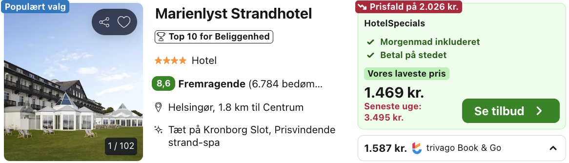 Bemærk: Den samlede pris for 2 personer i et dobbeltværelse er 1.469,- hvilket svarer til 735,- per person inkl. obligatorisk ekspeditionsgebyr. Vælg Hotelspecials på Trivago, så er adgang til spa inkluderet i prisen. Rejs365 er ikke et rejsebureau, men en rejseside, der finder gode tilbud! – Vi modtager kommission, men det påvirker ikke din pris! Læs mere her |