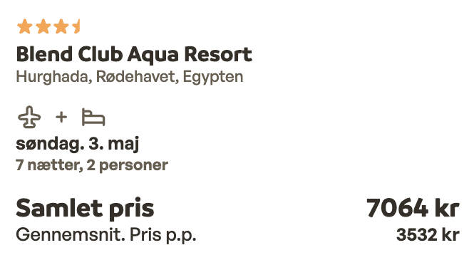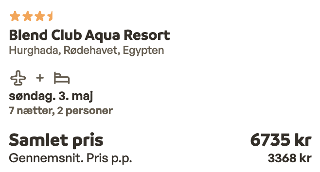 Hvis rejsen er med “Vis fly” og “Vis hotel” link, så er der tale om en sammensat rejse. Det vil sige at fly og hotel skal bestilles hver for sig. Prisen vi angiver vil dog være samlet for fly og hotel med mindre andet er angivet.