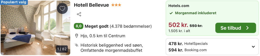 Bemærk: Den samlede pris for overnatningen er 1.436,- for 2 personer i et dobbeltværelse med morgenmad, hvilket svarer til 718,- per person Rejs365 er ikke et rejsebureau, men en rejseside, der finder gode tilbud! – Vi modtager kommission, men det påvirker ikke din pris! Læs mere her |