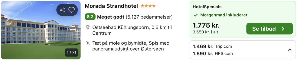 Vi har taget udgangspunkt i et ophold fra den 27. – 29. marts på Morada Strandhotel, der ligger direkte ved Østersøen i den charmerende badeby Kühlungsborn med udsigt til havet og den lange træmole. Hotellet tilbyder lyse værelser med balkon, en restaurant og bar med panoramaudsigt samt et stort wellnessområde med pool, sauna og spa. Den centrale beliggenhed tæt på strand, marina, caféer og shopping gør hotellet til et ideelt valg for en afslappende ferie med fokus på velvære og hyggelige gåture langs vandet.