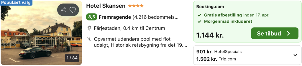 Bemærk: Den samlede pris for overnatningen er 900,- for 2 personer i et dobbeltværelse med morgenmad, hvilket svarer til 450,- per person Der kan være mindre prisforskelle på mobil og pc. Undersøg med fordel, hvor det er billigst inden bestilling. Rejs365 er ikke et rejsebureau, men en rejseside, der finder gode tilbud! – Vi modtager kommission, men det påvirker ikke din pris! Læs mere her |