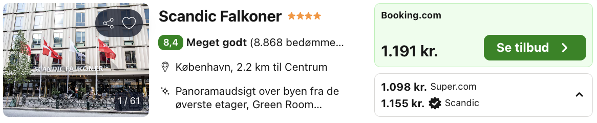 Vi har taget udgangspunkt i et weekendophold fra den 30. april – 1. maj på Scandic Falkoner, et elegant og moderne hotel beliggende midt på Frederiksberg i København. Hotellet kombinerer klassisk teaterstemning med skandinavisk design og byder på en atmosfære, der emmer af kultur og komfort. Her kan du slappe af i de stilfulde værelser, nyde en middag i hotellets restaurant eller tage en drink i den hyggelige bar. Med Falkoner Salen, Frederiksberg Have og metroen lige ved døren er det et ideelt udgangspunkt – uanset om du besøger byen for koncert eller en afslappende storbyweekend.
