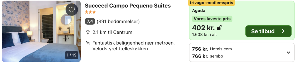 | Bemærk: Den samlede pris for hotellet er 1.581,- for 2 personer i et dobbeltværelse, hvilket svarer til 791,- per person. |