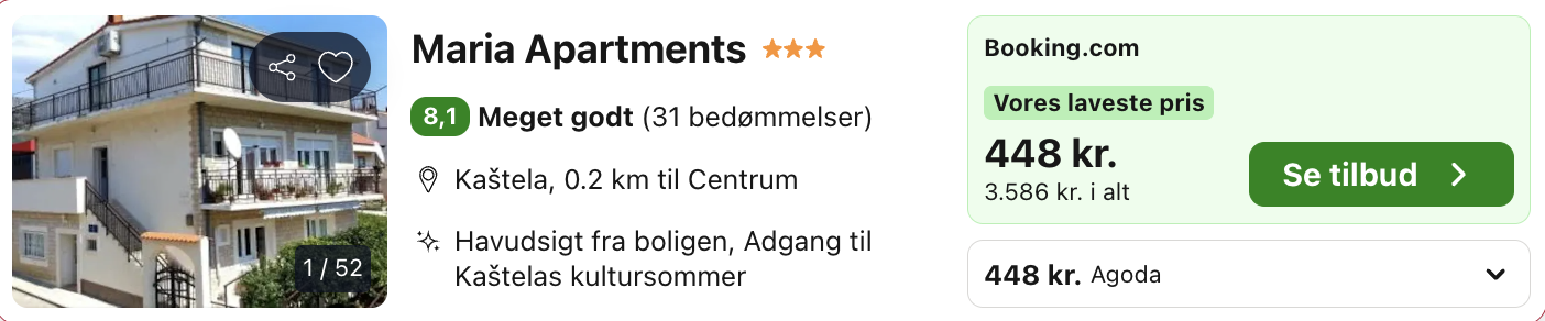 Maria Apartments i Kaštela er et mindre og roligt hotel med en afslappet atmosfære tæt på både strand og lokale restauranter. Hotellet ligger i et hyggeligt område mellem Split og Trogir, hvilket gør det nemt at kombinere badeferie med oplevelser i området. Lejlighederne er enkelt indrettet med egen balkon og køkkenfaciliteter, så der er god mulighed for at nyde ferien i eget tempo.