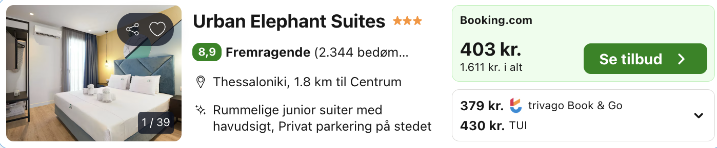 Vi har taget udgangspunkt i det 3-stjernede Urban Elephant Suites, der modtager fremragende bedømmelser af de tidligere gæster og bl.a. byder på flotte værelser og en god beliggenhed i Thessaloniki.
