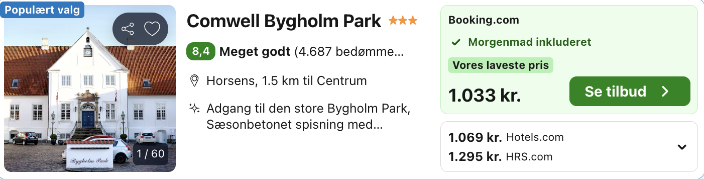 Bygholm Park er en smuk gammel herregård, der har tilhørt den danske kongefamilie og været bolig for adelsfamilier og godsejere. I dag er det er lækkert 4-stjernet hotel med 142 værelser og beliggenhed ved den skønneste natur omgivet af søer og skove. Du kan nyde roomservice fra hotellets restaurant eller nyde maden på terrassen med smuk udsigt over parken. Hotellet er indrettet i originalt 1700-tals interiør og byder på unik stemning og charme.