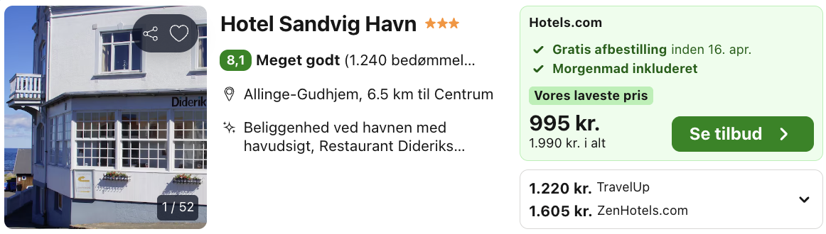 Vi har taget udgangspunkt i et ophold på Hotel Sandvig Havn fra den 17. – 19. april, som ligger helt ud til den lille havn i Sandvig og har en atmosfære, hvor nærheden til vandet straks mærkes. Den charmerende beliggenhed giver udsigt til både klipper og hav, og hotellet fremstår som et roligt udgangspunkt midt i den særlige bornholmske stemning. Værelserne er enkle og lyse, og flere af dem har udsigt over enten havnen eller de karakteristiske klippeformationer, som området er kendt for. Ferielejlighederne giver ekstra plads og frihed, og de ligger i samme hyggelige rammer.