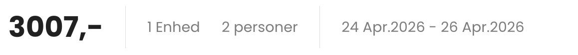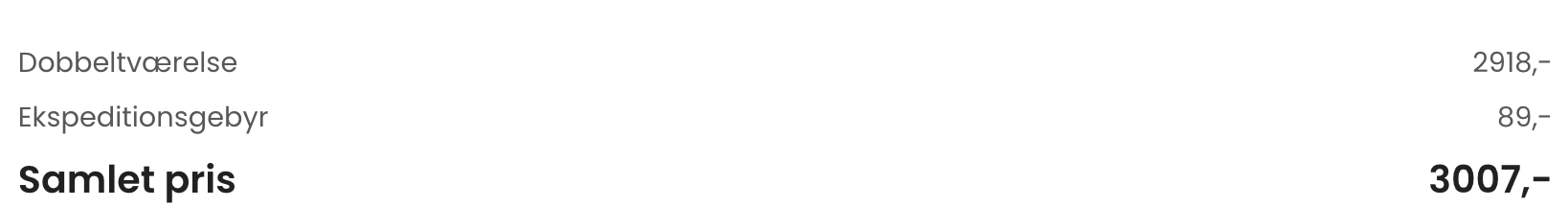 Bemærk: Den samlede pris for opholdet er 3.007,- for 2 personer i et dobbeltværelse, hvilket svarer til 1.504,- per person inkl. obligatorisk ekspeditionsgebyr på 89,- per booking.