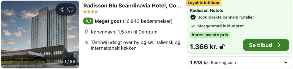 Vi har taget udgangspunkt i et ophold fra den 12. – 13. april på Radisson Blu Scandinavia Hotel, Copenhagen, der er et moderne og luksuriøst hotel beliggende i hjertet af København, tæt på byens største seværdigheder, shoppingområder og kulturliv. Hotellet kombinerer stilfuld indretning med fremragende service og tilbyder et ideelt valg for både forretningsrejsende og turister, der ønsker at opleve byen i komfortable omgivelser.