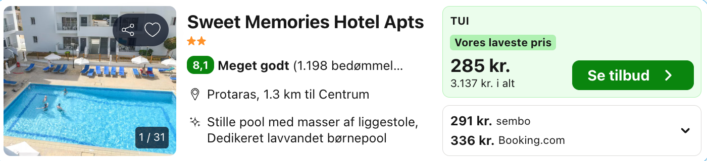 Hvis rejsen er med “Vis fly” og “Vis hotel” link, så er der tale om en sammensat rejse. Det vil sige at fly og hotel skal bestilles hver for sig. Prisen vi angiver vil dog være samlet for fly og hotel med mindre andet er angivet.
