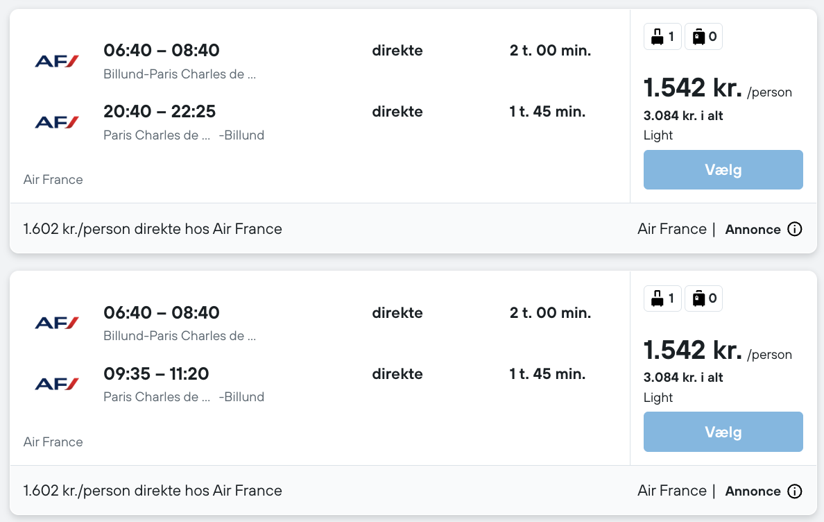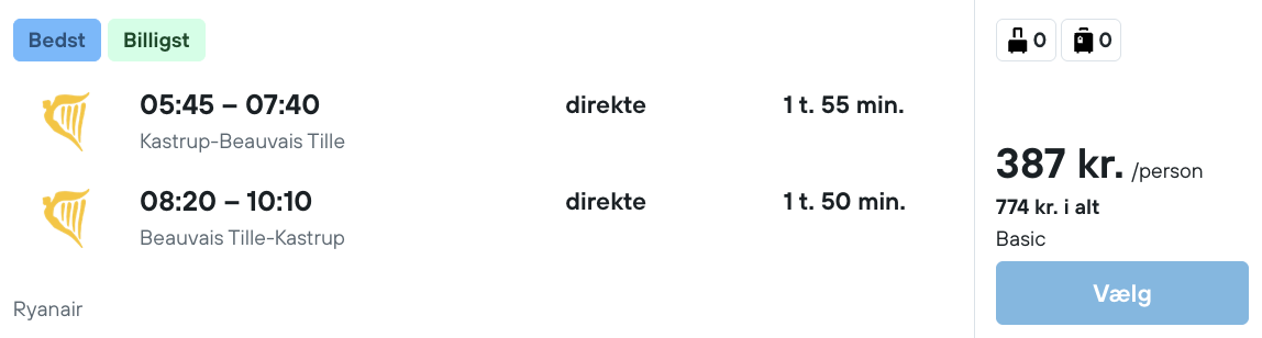 Tjek altid datoerne for at se om de passer sammen før du bestiller, da vi kan have begået fejl. Tjek derudover også prisen på begge ting før du bestiller det ene, da prisen kan have ændret sig. Der kan også være små variationer i prisen mellem mobil og pc.