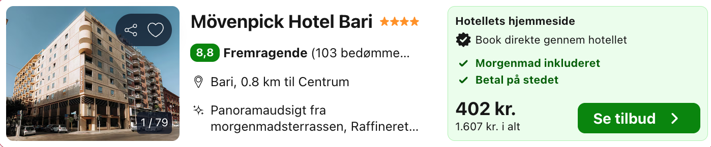 Bemærk: Den samlede pris for hotellet er 1.607,- for 2 personer i et dobbeltværelse, hvilket svarer til 804,- per person. Der kan være mindre prisforskelle på mobil og pc. Undersøg med fordel, hvor det er billigst inden bestilling.