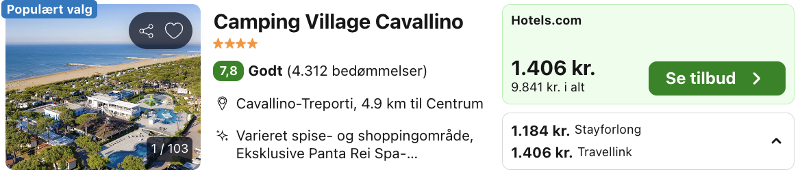 | Bemærk: Den samlede pris for hotellet/campingpladsen er 8.288,- for 4 personer, hvilket svarer til 2.072,- per person. |