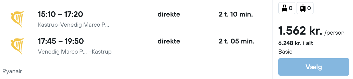 Hvis du/I ikke ønsker at køre, men derimod at flyve, så har vi på vores flysøgemaskine fundet billige billetter fra København til Vendig.