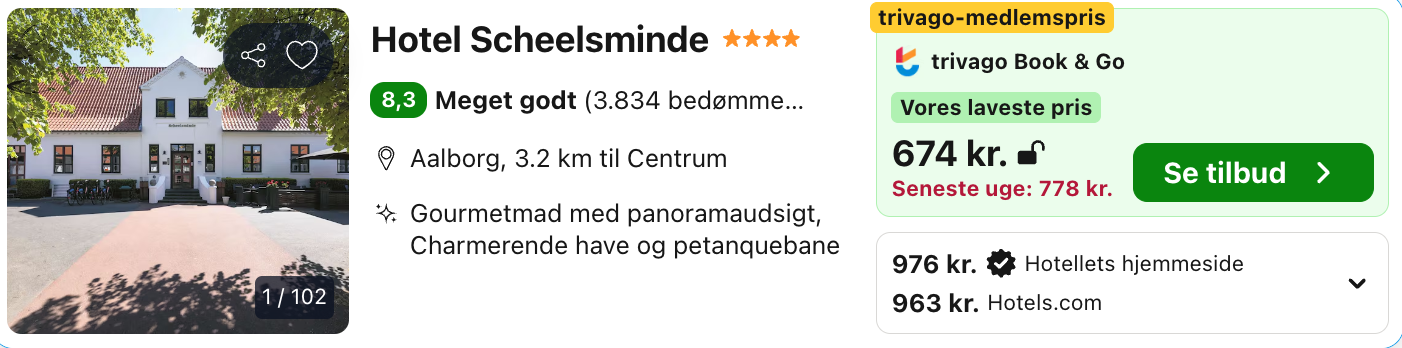 Bemærk: Den samlede pris for opholdet er 674,- for 2 personer i et dobbeltværelse, hvilket svarer til 337,- per person.