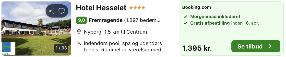 Med malerisk udsigt direkte ud over Storebælt og tæt ved bøgeskov er Hotel Hesselets beliggenhed helt vidunderlig. Hotellet er et af Danmarks smukkeste designhoteller med sans for detaljer og kvalitet. Her kan du nyde hotellets wellnessfaciliteter, hvor du kan tage en svømmetur i poolen eller forkæle dig selv med en afslappende massage eller en tur i boblebadet. Tag dig også tid til at koble af i saunaen inden du smager den lækre gourmetmad på Hesselets egen restaurant.