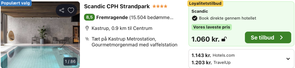 Scandic CPH Strandpark er et moderne og komfortabelt hotel beliggende i en smuk kystnær beliggenhed i København. Hotellet tilbyder en ideel base for både forretningsrejsende og turister, der ønsker at udforske byen, samtidig med at de nyder en afslappende og naturskøn atmosfære.