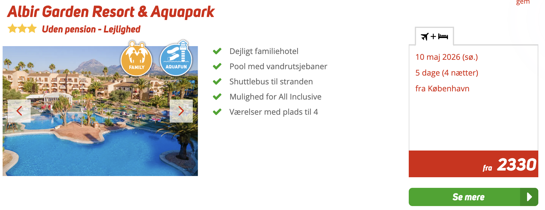 5 dage i Albir for kun 2.330,- per person inkl. fly og godt 3-stjernet hotel med pools og eget vandland!