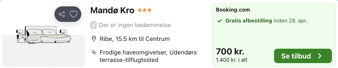 Bemærk: Den samlede pris for opholdet er 1.400,- for 2 personer, hvilket svarer til 700,- per person. Rejs365 er ikke et rejsebureau, men en rejseside, der finder gode tilbud! – Vi modtager kommission, men det påvirker ikke din pris! Læs mere her