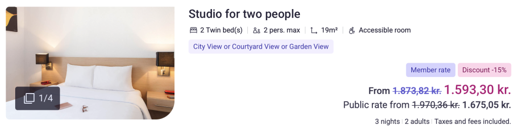 | Bemærk: Den samlede pris for overnatningen er 1.593,- for 2 personer i et dobbeltværelse, hvilket er 797,- per person. |