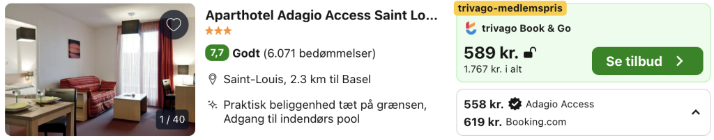 Vi har taget udgangspunkt i det 3-stjernede Aparthotel Adagio access Saint-Louis, der modtager gode bedømmelser fra de tidligere gæster og bl.a. har pæne værelser, indendørs pool og god beliggenhed i Basel.