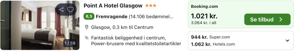 Point A Hotel Glasgow ligger centralt i byen, tæt på George Square, Buchanan Street og de mange butikker, barer og restauranter, der giver Glasgow sin livlige storbystemning. Hotellet er indrettet i en moderne, kompakt stil med fokus på det vigtigste: gode senge, mørklægning, effektiv lydisolering og smart belysning, som styres enkelt. Værelserne er ikke store, men meget funktionelle, så du får en praktisk base midt i byen uden unødvendige dikkedarer.