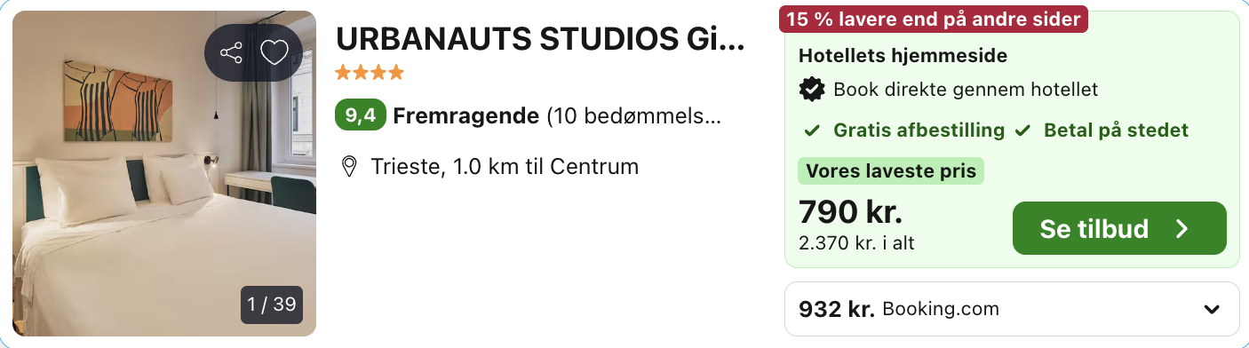 Bemærk: Husk at lade søgningen blive helt færdig. Vælg Laveste Pris på Trivago. Der kan være mindre prisforskelle på mobil og pc. Undersøg med fordel, hvor det er billigst inden bestilling.