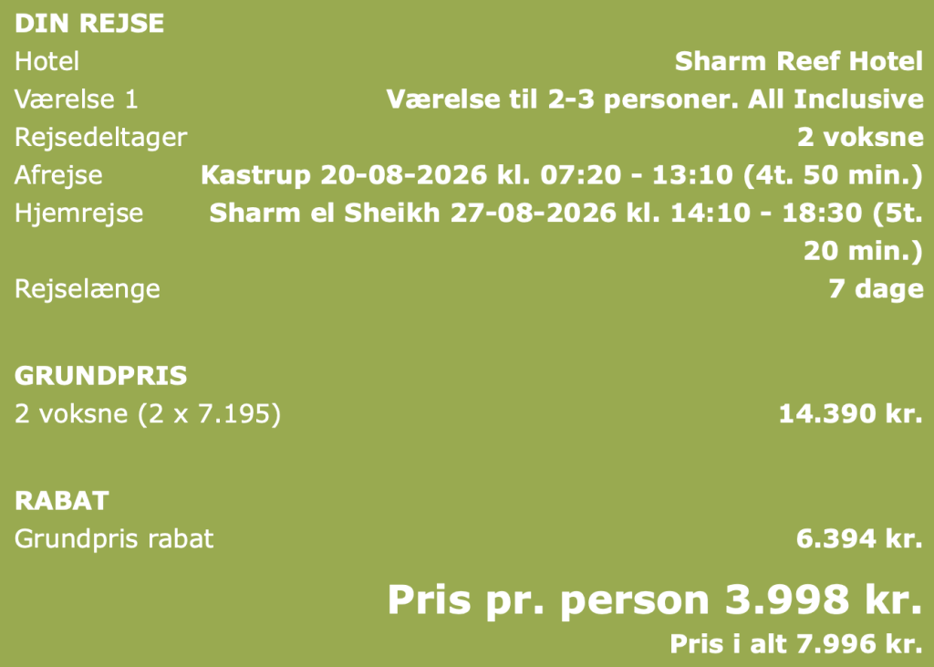 Hvis rejsen er med “Vis rejse” link, så er der tale om en pakkerejse, hvor fly og hotel bestilles på en gang.
