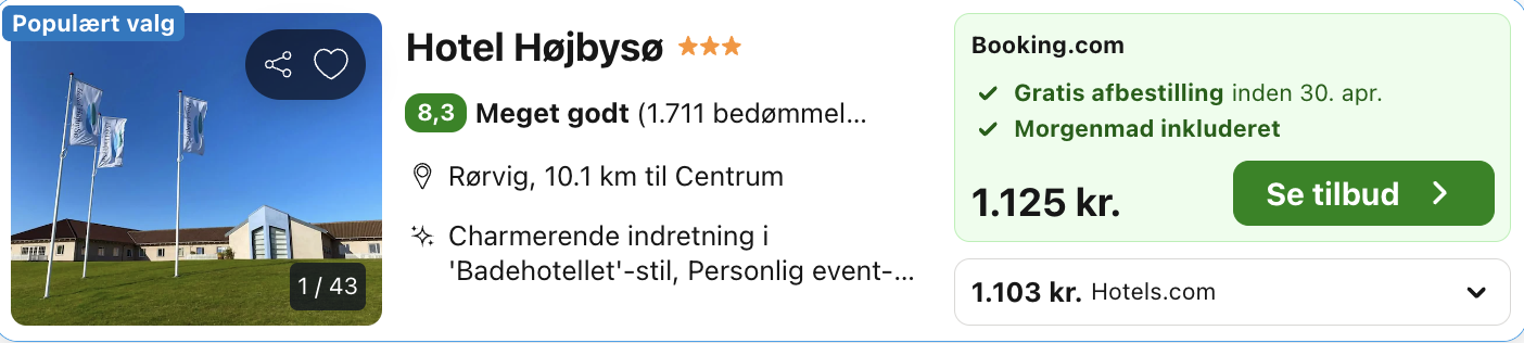 Bemærk: Den samlede pris for opholdet er 1.103,- for 2 personer i et dobbeltværelse, hvilket er 552,- per person. Der kan være mindre prisforskelle på mobil og pc. Undersøg med fordel, hvor det er billigst inden bestilling. Rejs365 er ikke et rejsebureau, men en rejseside, der finder gode tilbud! – Vi modtager kommission, men det påvirker ikke din pris! Læs mere her
