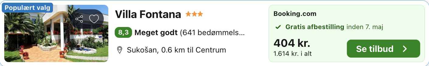 Villa Fontana ligger i den hyggelige kystby Sukošan, hvor stemningen er rolig, og havet altid er tæt på. Her bor du i overskuelige og afslappede omgivelser, som passer godt til en ferie med fokus på nærvær, sol og afslapning ved Adriaterhavet. Byens lille marina, lokale restauranter og strandpromenade skaber en autentisk ramme om opholdet, og tempoet er markant lavere end i de større feriebyer.