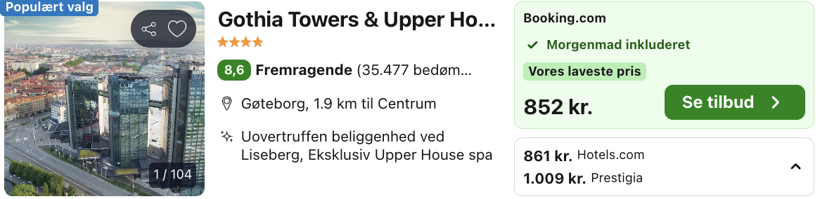 Bemærk: Den samlede pris for overnatningen er 852,- for 2 personer i et dobbeltværelse med morgenmad, hvilket svarer til 426,- per person. Adgang til spa koster 695,- SEK hvilket svarer til 487,- danske kroner og bestilles direkte hos hotellet. Rejs365 er ikke et rejsebureau, men en rejseside, der finder gode tilbud! – Vi modtager kommission, men det påvirker ikke din pris! Læs mere her |