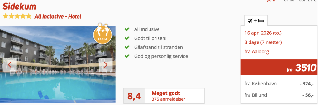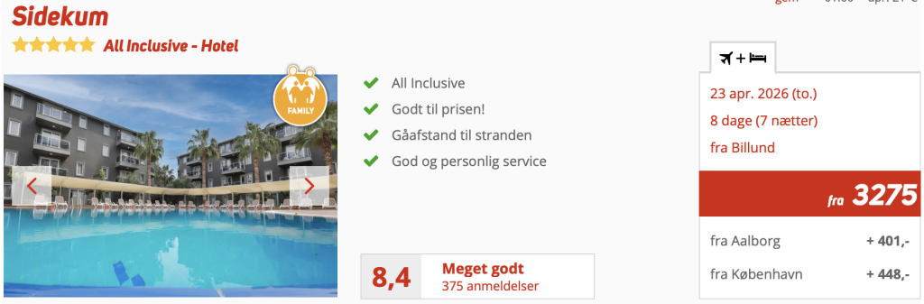 Hvis rejsen er med “Vis fly” og “Vis hotel” link, så er der tale om en sammensat rejse. Det vil sige at fly og hotel skal bestilles hver for sig. Prisen vi angiver vil dog være samlet for fly og hotel med mindre andet er angivet.