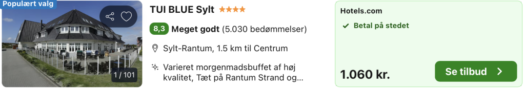 Vi har taget udgangspunkt i et ophold fra den 25. – 26. april på TUI BLUE Sylt, der ligger idyllisk placeret i Rantum, på den smaleste del af den tyske ø Sylt. Hotellet tilbyder en moderne og komfortabel base for både familier og par, der ønsker at nyde den unikke natur og ro, som denne del af Vadehavet har at byde på.