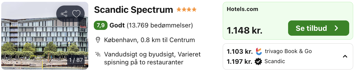 Bemærk: Den samlede pris for overnatningen er 1.103,- for 2 personer i et dobbeltværelse, hvilket svarer til 552,- per person.