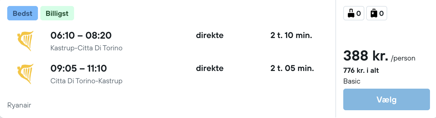 Flyprisen inkluderer kun en lille taske, men bagage kan tilkøbes.