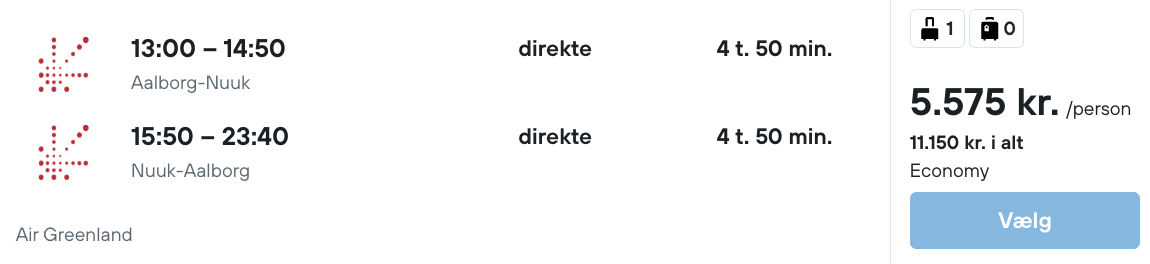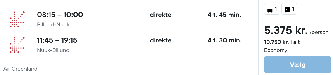 På vores flysøgningsmaskine har vi fundet billige flybilletter fra København, Billund og Aalborg til Nuuk i Grønland: