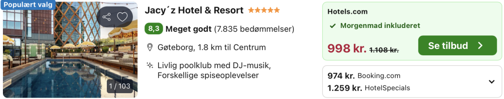 Vi har taget udgangspunkt i et ophold fra den 3. – 4. maj på Jacy’z Hotel & Resort ligger centralt i Göteborg, tæt på både Scandinavium, Liseberg og byens pulserende restaurant- og kulturliv. Hotellet er et moderne lifestyle-hotel med et markant design og en urban resortstemning, hvor luksus, leg og afslapning går hånd i hånd. Værelserne er stilfuldt indrettet med mørke nuancer, komfortable senge og store vinduer, der giver udsigt over byen og skaber en eksklusiv, men afslappet atmosfære.