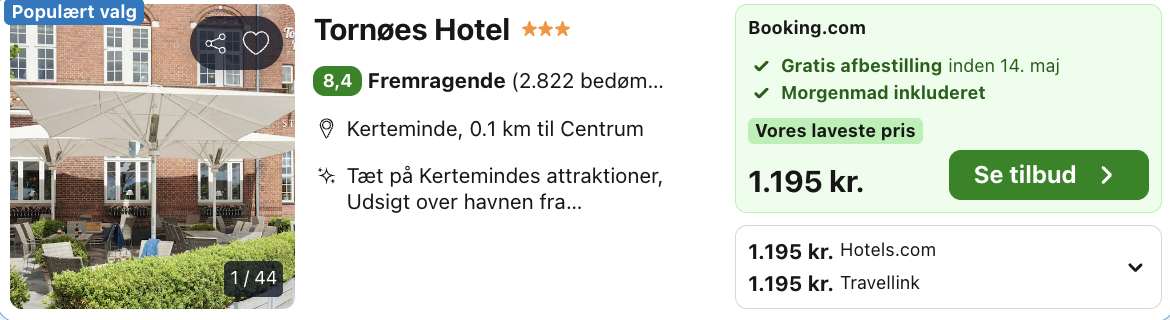 Vi har taget udgangspunkt i et weekendophold på Tornøes Hotel, som er et historisk og charmerende hotel beliggende centralt i Kerteminde på Fyn, tæt på både havnen, fjorden og byens centrum med kort afstand til seværdigheder og strand. Hotellet har en klassisk atmosfære med rødder mere end 150 år tilbage og tilbyder en hyggelig base for ophold i området. Morgenmad er inkluderet i opholdet og serveres som en buffet, hvilket giver gæsterne en god start på dagen.