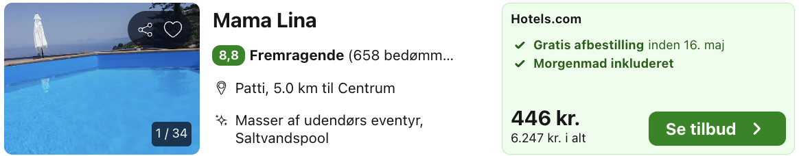 Hvis rejsen er med “Vis fly” og “Vis hotel” link, så er der tale om en sammensat rejse. Det vil sige at fly og hotel skal bestilles hver for sig. Prisen vi angiver vil dog være samlet for fly og hotel med mindre andet er angivet.