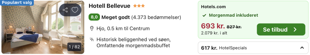 Bemærk: Den samlede pris for overnatningen er 1.851,- for 2 personer i et dobbeltværelse med morgenmad, hvilket svarer til 926,- per person Rejs365 er ikke et rejsebureau, men en rejseside, der finder gode tilbud! – Vi modtager kommission, men det påvirker ikke din pris! Læs mere her |