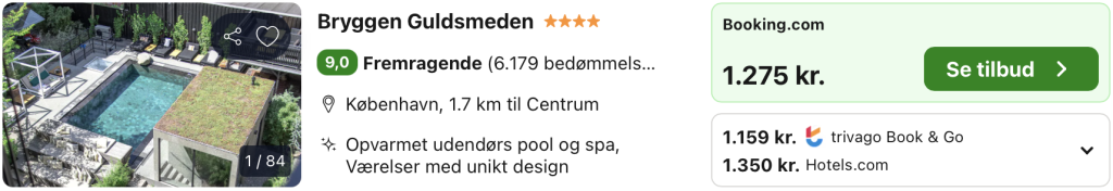 Bemærk: Den samlede pris for opholdet er 1.159,- for 2 personer i et dobbeltværelse, hvilket svarer til 580,- per person. Der kan være mindre prisforskelle på mobil og pc. Undersøg med fordel, hvor det er billigst inden bestilling. Rejs365 er ikke et rejsebureau, men en rejseside, der finder gode tilbud! – Vi modtager kommission, men det påvirker ikke din pris! Læs mere her |