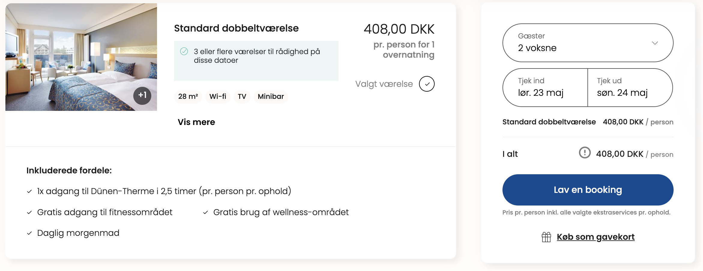 Vi har taget udgangspunkt i et weekendophold fra den 23. – 24. maj, men der er mange andre datoer i april, maj og juni på Ambassador Hotel & Spa til gode priser.
