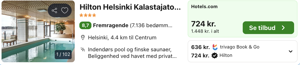 Hotellet vi har fundet er et lækkert Hilton Hotel, hvor du kan bo i en iglo direkte ud til vandet. Her kan du ligge i sengen og nyde den mest fantastiske udsigt, mens du samtidig kun er 10 minutter væk fra det centrale Helsinki!