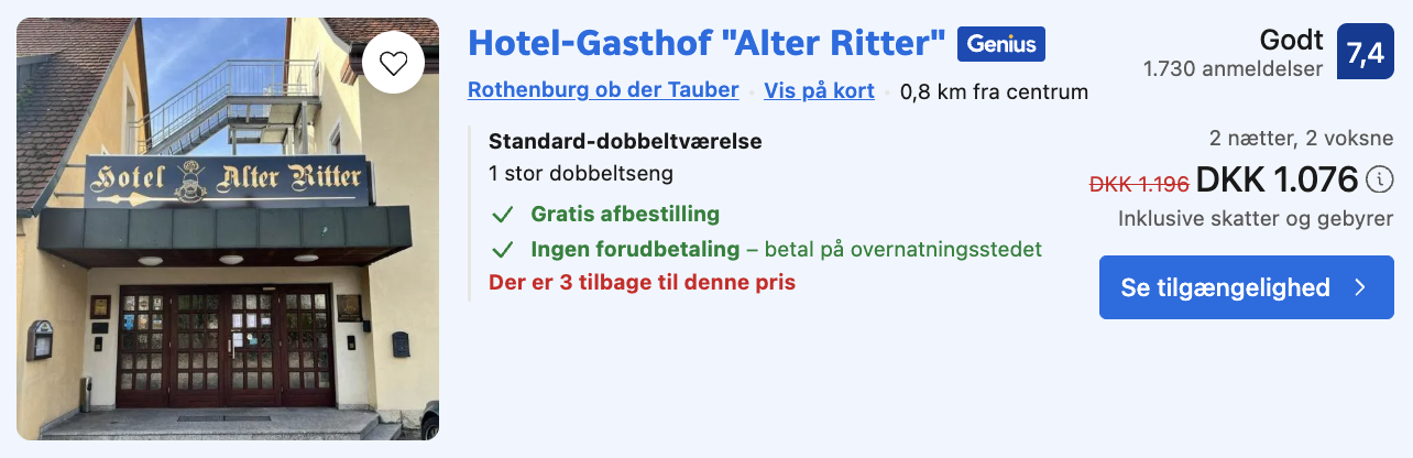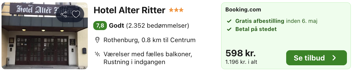 Hotellet tilbyder enkle og komfortable værelser med moderne faciliteter samt gratis parkering og en afslappet atmosfære. Samlet set er Hotel Alter Ritter et godt valg for rejsende, der ønsker en prisvenlig og autentisk base i en af Tysklands mest charmerende byer.