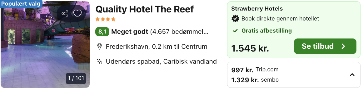 Drømmer du om caribisk varme, tropisk stemning og masser af vand sjov? Quality Hotel The Reef i Frederikshavn byder på et stort, nyrenoveret vandland med 10 pools, en 80 meter lang vandrutsjebane, jungleflod, bølgebassin og en 3,5 meter dyb dykkerpool. Her kan du svømme blandt palmer, klipper og tropiske lyde – og året rundt glide direkte ud i den opvarmede udendørspool.