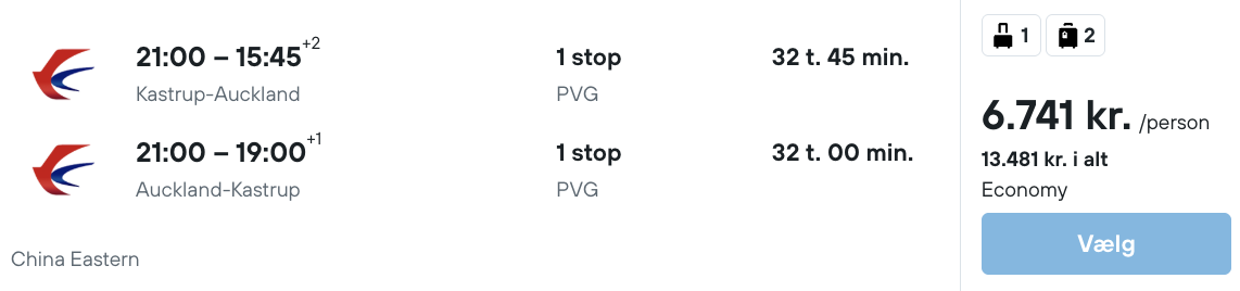 Rejs365 er ikke et rejsebureau, men en rejseside, der finder gode tilbud! – Vi modtager kommission, men det påvirker ikke din pris! Læs mere her Udrejse fra København er den 16. maj, mens ankomst i Auckland er den 18. maj |