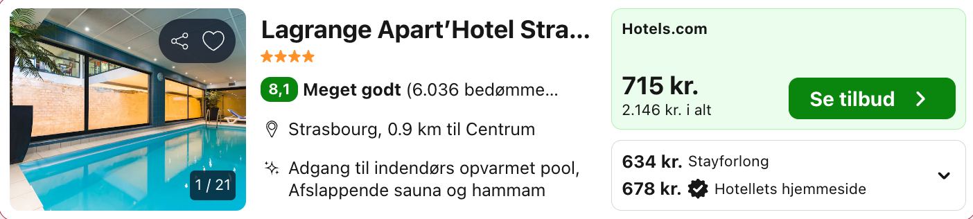 | Bemærk: Husk at lade søgningen blive helt færdig. Der kan være mindre prisforskelle på mobil og pc. Undersøg med fordel, hvor det er billigst inden bestilling. Vælg Laveste Pris på Trivago.
