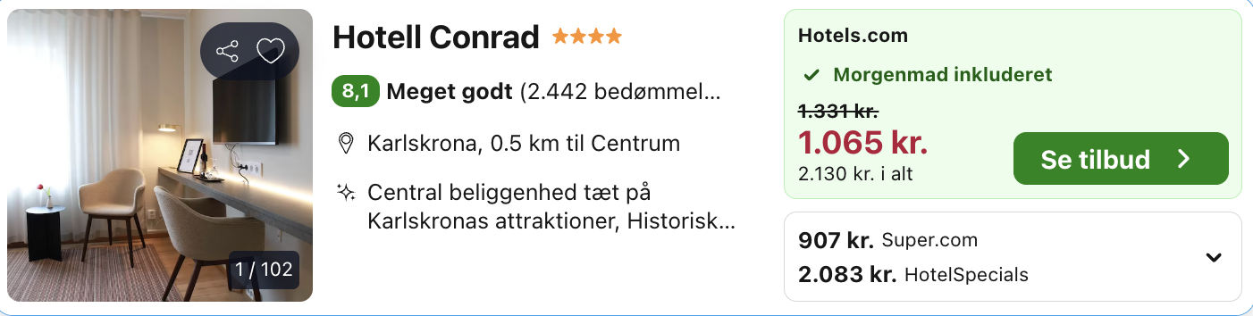 Midt i den charmerende kystby Karlskrona ligger Hotell Conrad – et hyggeligt og personligt hotel med en hjemlig atmosfære. Her bor du tæt på byens historiske centrum, marinaen og det smukke skærgårdsmiljø, som Karlskrona er kendt for.