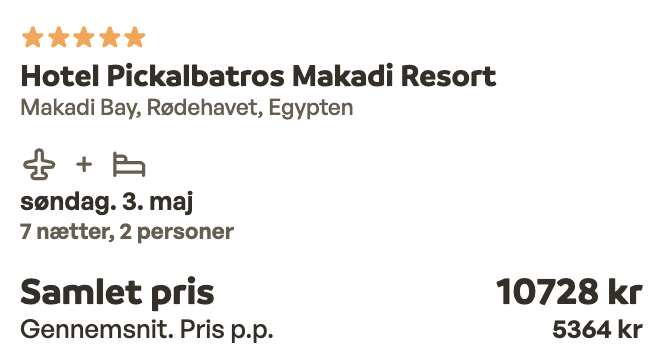Hvis rejsen er med “Vis fly” og “Vis hotel” link, så er der tale om en sammensat rejse. Det vil sige at fly og hotel skal bestilles hver for sig. Prisen vi angiver vil dog være samlet for fly og hotel med mindre andet er angivet.