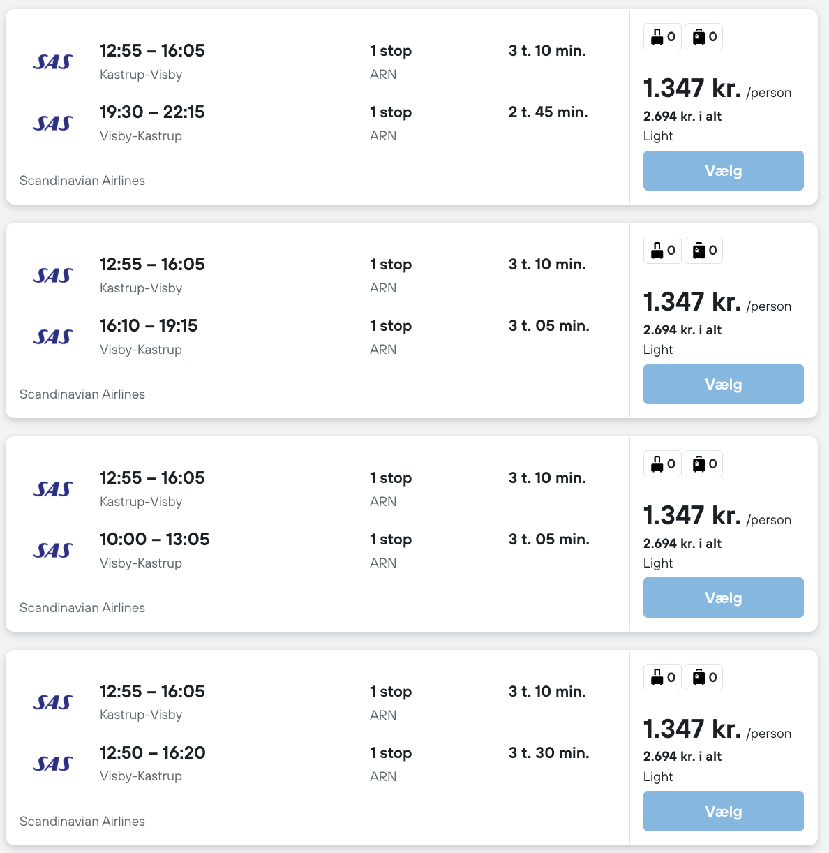 Vi har fundet billige flybilletter fra København til Gotland. Der er flere forskellige flytider at vælge mellem til samme pris.